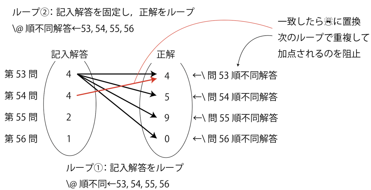 続いて,最も難関な順不同問題の処理を行います。方針として,順不同問題のそれぞれについてループを回し,解答と比較します。よって,計算量のオーダーとしては,n2のオーダーになります。このとき,正解した際に解答を☃に置き換えることがポイントです。こうすることで,同じ解答に対して重複して加点されるのを防ぎます。